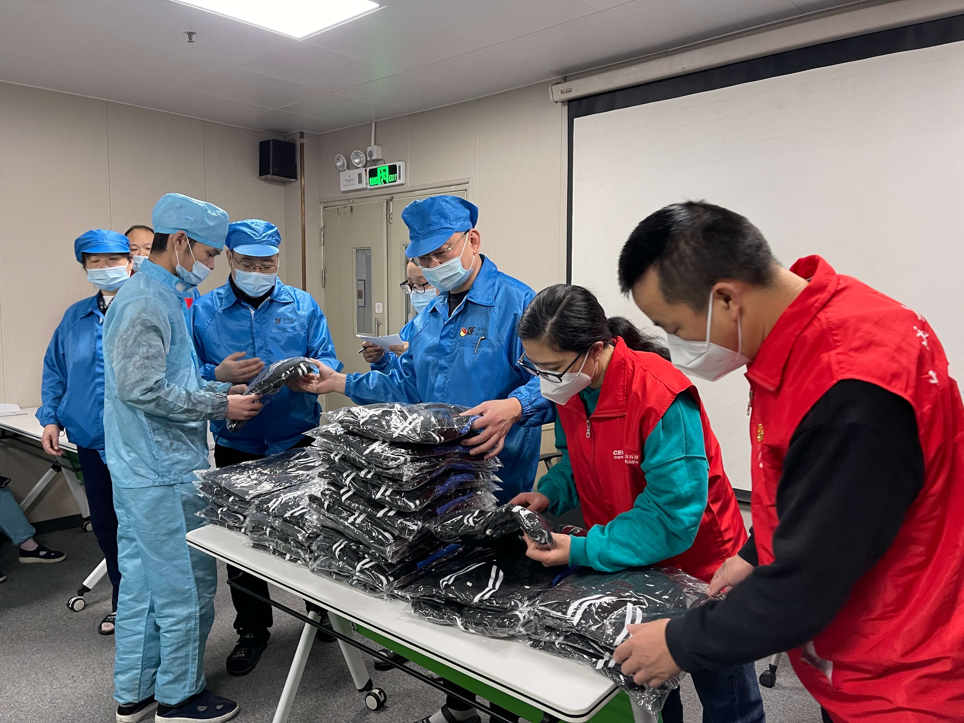 既送清涼,又送溫暖。進入封控管理的第4天,深圳石巖的天氣由溫熱驟然到冰涼,前幾日發出的“送清涼”T恤43件已不能御寒,公司工會連夜整備“送溫暖”長袖會員服及厚裝馬甲57件,發放給僅穿短袖的產線員工、工業園管理處、政府派駐人員。