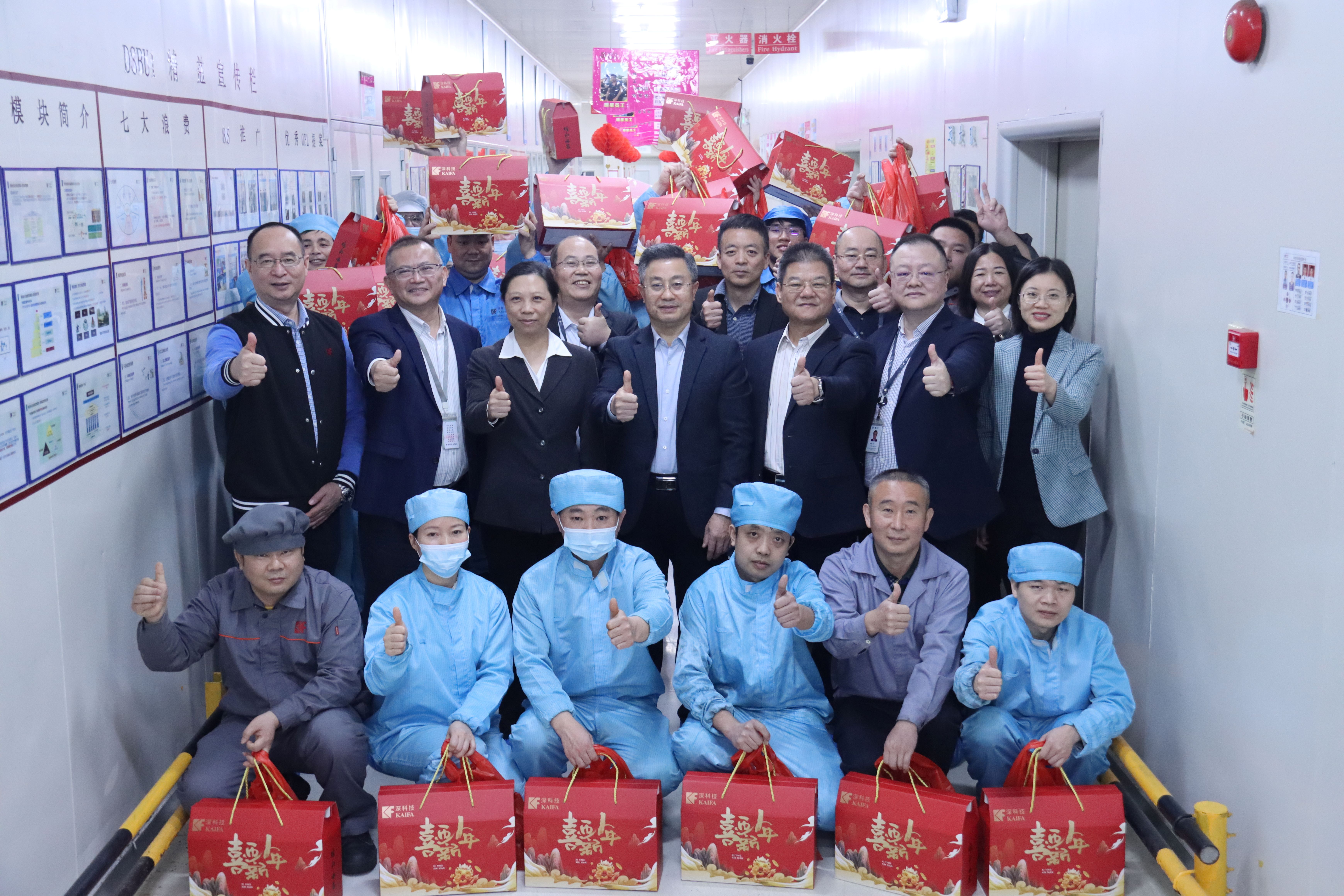1月24日,深科技東莞舉辦留莞過年員工慰問活動。公司黨委書記、董事長韓宗遠(yuǎn),黨委委員、高級副總裁周庚申,高級副總裁于化榮,黨委委員、高級副總裁莫尚云,監(jiān)事會主席肖澗毅,總裁助理修樂欣,黨委委員、總裁助理辛艷霞、彭秧,工會副主席邱勝及深科技東莞主要負(fù)責(zé)人來到CIBU、SDBU、ATBU生產(chǎn)車間及行政辦公樓走訪,把慰問品送到一線員工手中,向大家送上新春祝福。韓宗遠(yuǎn)感謝員工選擇制造業(yè)、選擇深科技、立足崗位、歷練成長,鼓勵大家好好工作。基層員工備受鼓舞。